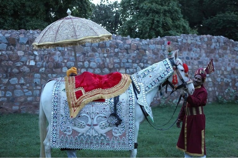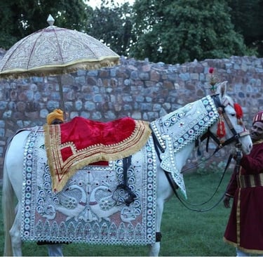 A beautifully adorned mare, symbolizing elegance and tradition, carrying the groom with pride and dignity. Decorated with royal accessories, she represents the grandeur of the wedding procession and adds charm to the groom’s entry.”